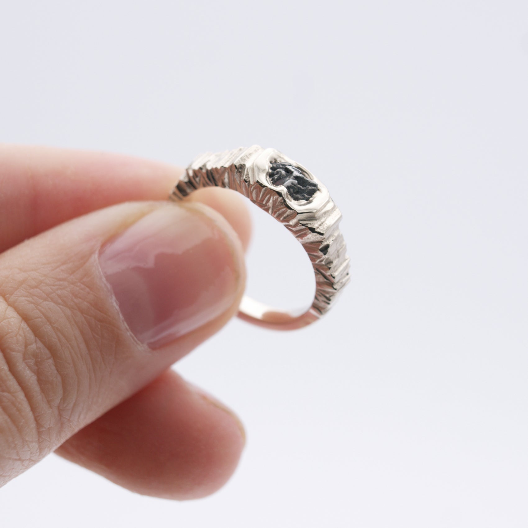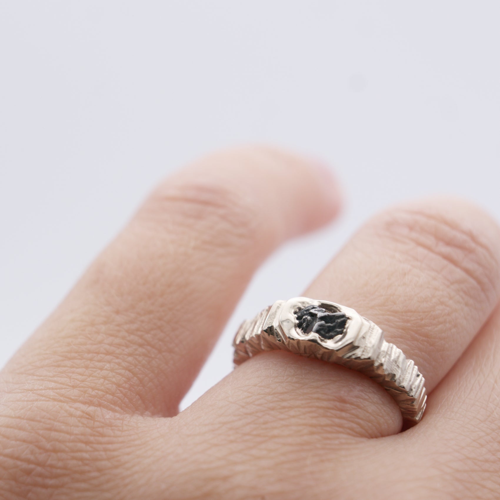 ENGAGEMENT RING WITH METEORITE AND BLACK SAPPHIRE