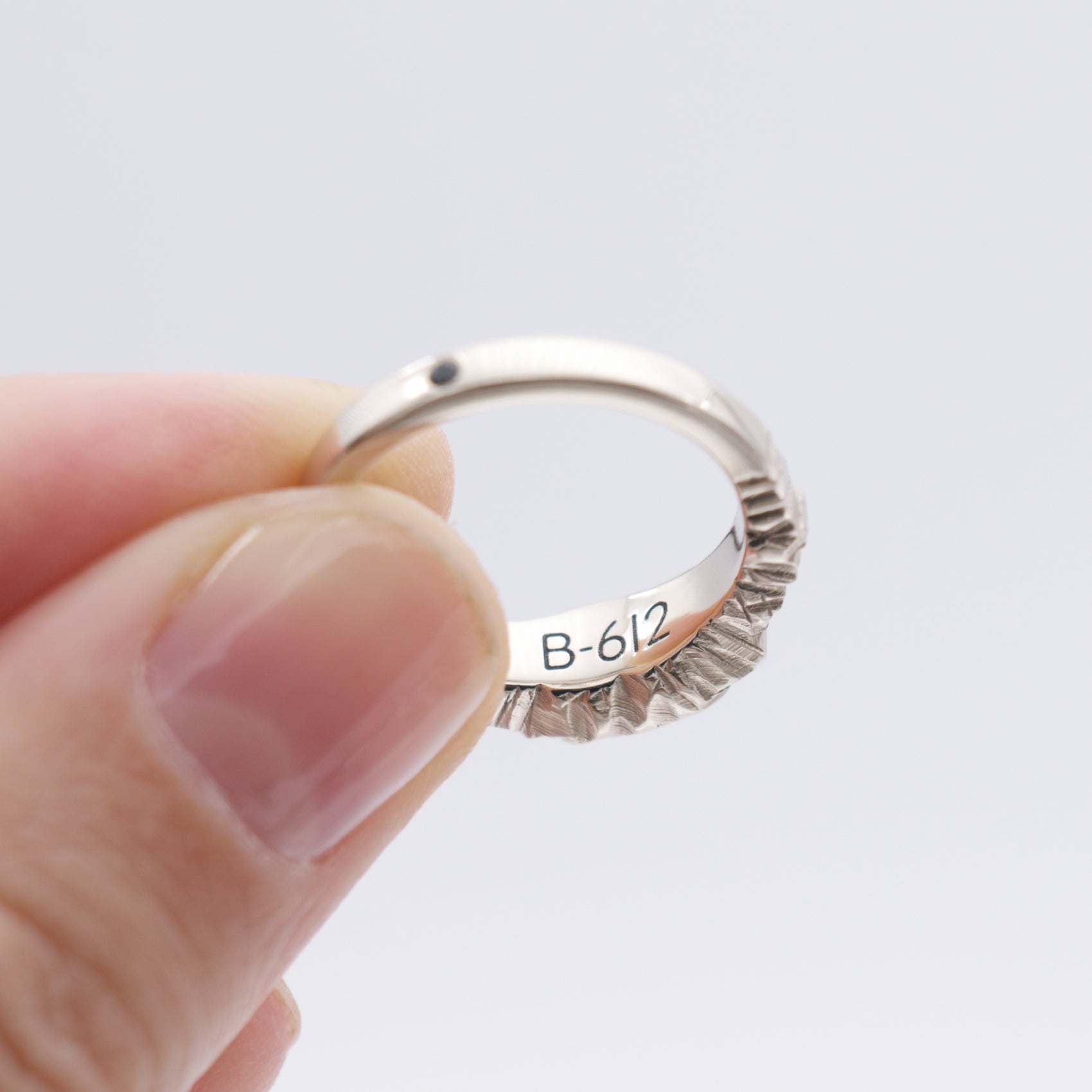 This engagement ring is made from 14K (585) recycled white gold, set with Campo del Cielo meteorite and an ethical black sapphire. The texture reflects the couple’s love for mountains, and the meteorite was chosen because the bride-to-be once mentioned that meteorite jewelry seemed especially interesting to her—something she said years before the proposal. Inside, the engraving of the planet’s name from The Little Prince is a small nod to the beginning of their relationship. To balance all the celestial elements, something grounding was added: a tiny black sapphire on the back of the ring.